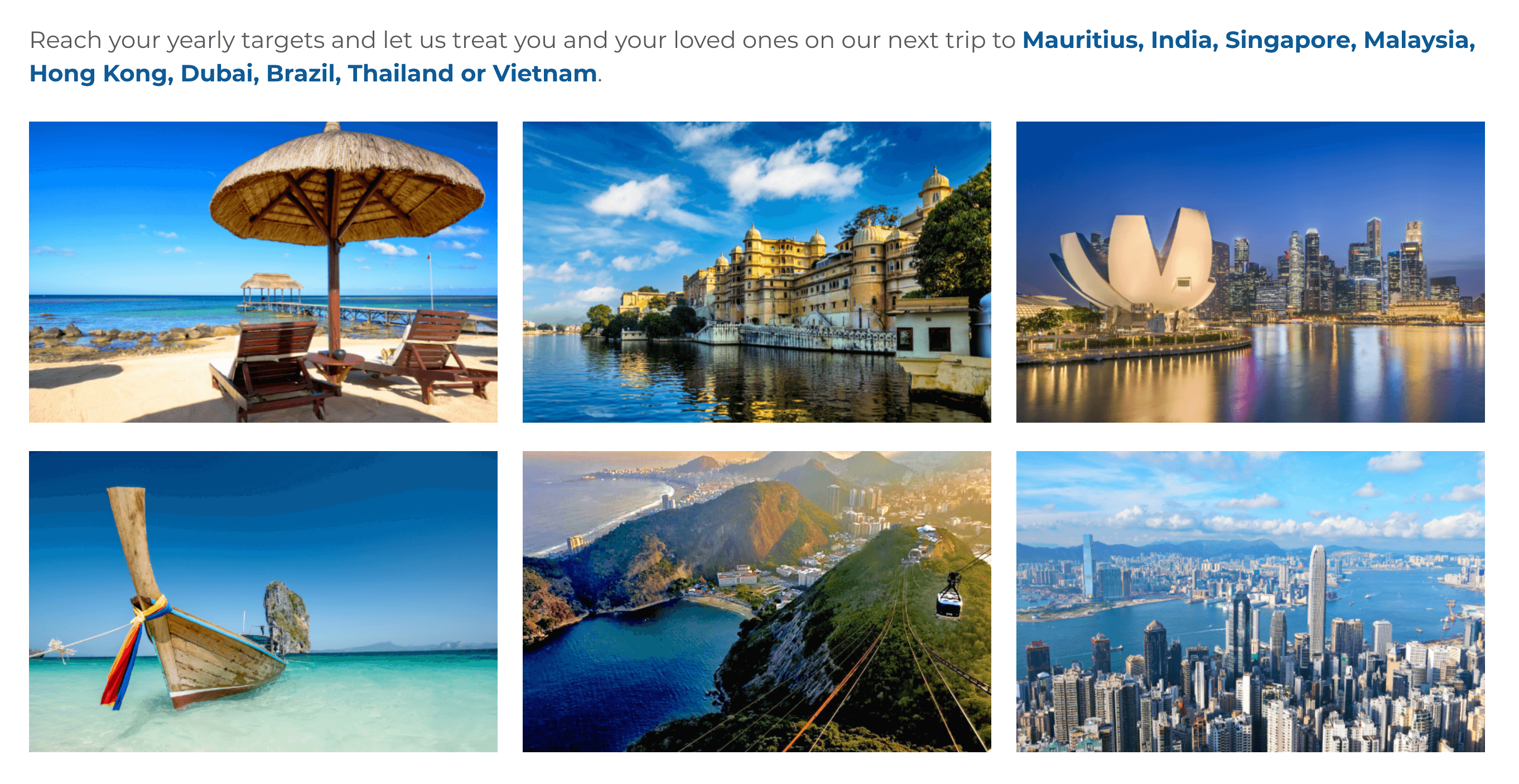 For over 30 years we have rewarded our top performing sales consultants with executive international incentive trips. Some of the destinations include Brazil, Singapore, Malaysia, Hong Kong, Dubai, India, Thailand or Vietnam.